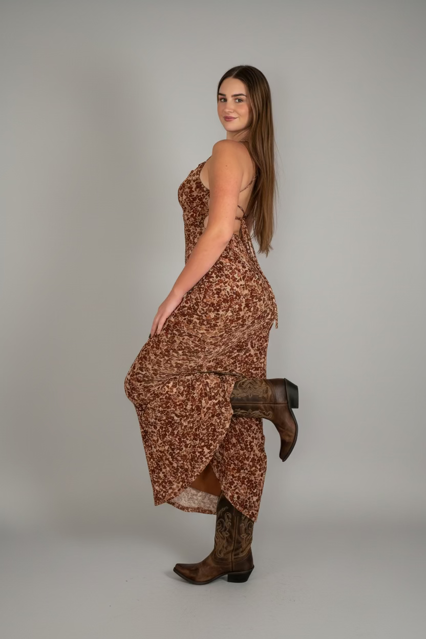 Slip into effortless style with our Fireside Glow Dress, featuring a breathable mesh construction that keeps you cool while looking hot. Warm autumn hues create that cozy-chic vibe we're obsessed with, while delicate florals add a touch of romance. The adjustable strappy tie back lets you customize the fit to perfection—because comfort should never be compromised. Perfect for those golden-hour moments when the weather's crisp but your style stays fire.