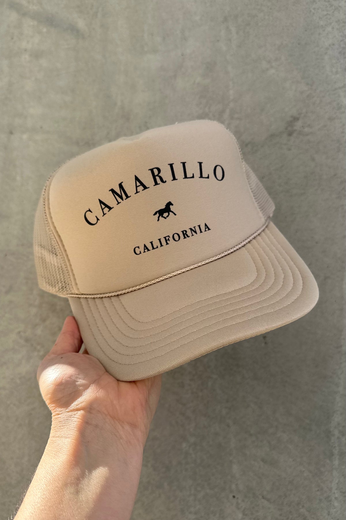 Our Camarillo trucker hat features custom lettering, a foam front, mesh backing, and adjustable snapback.