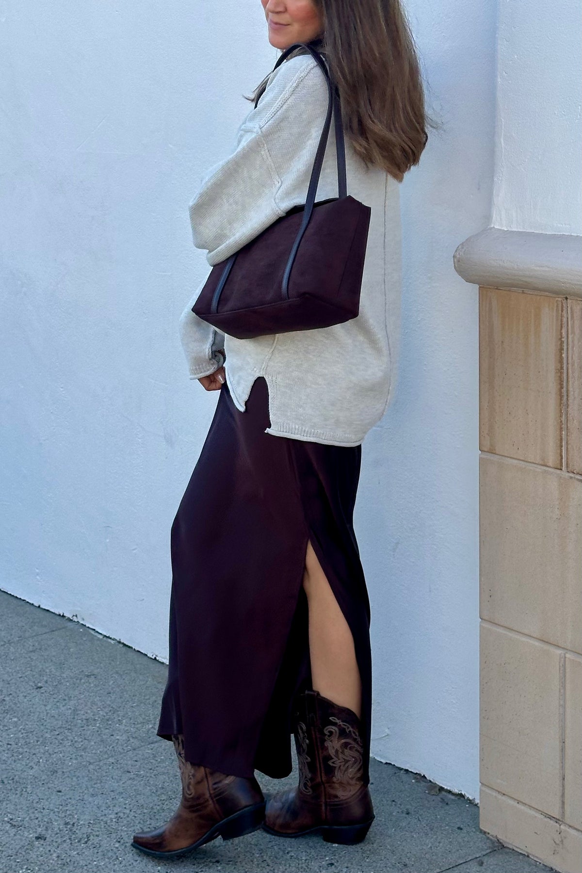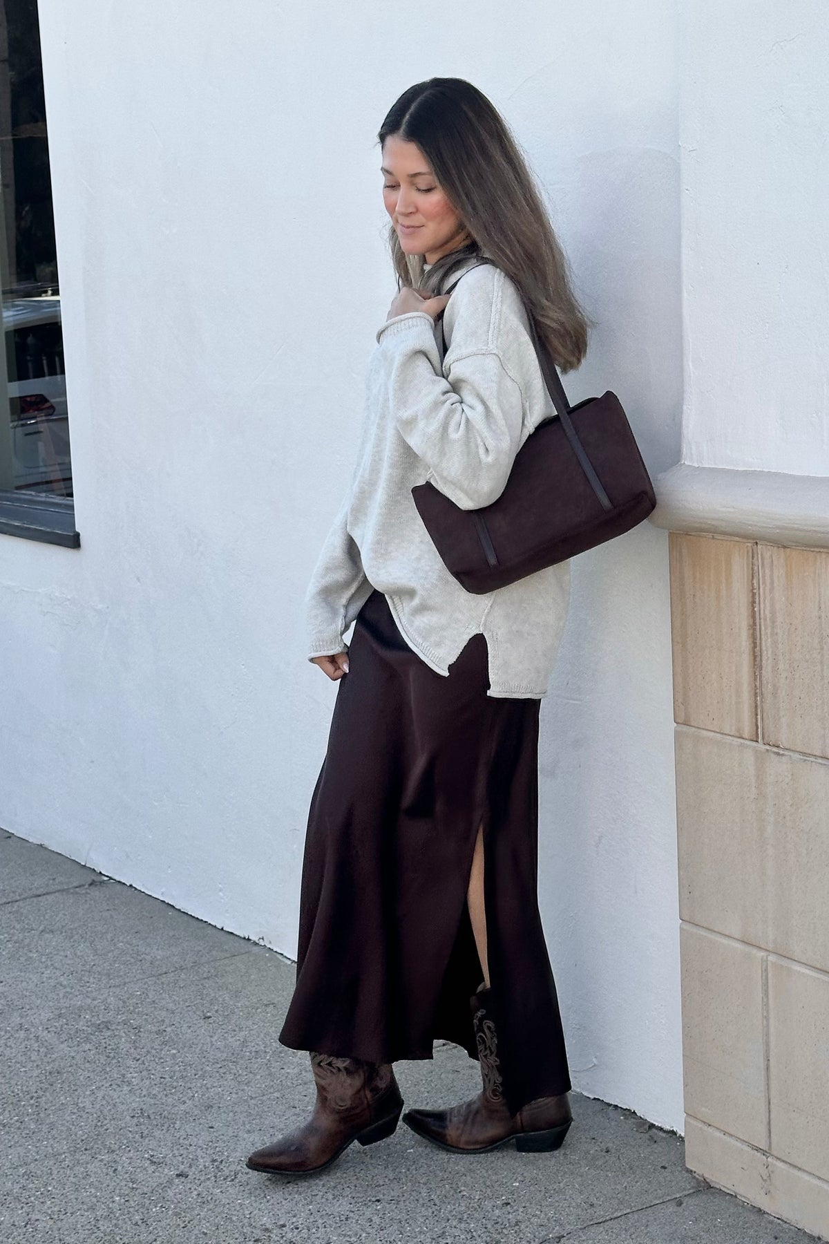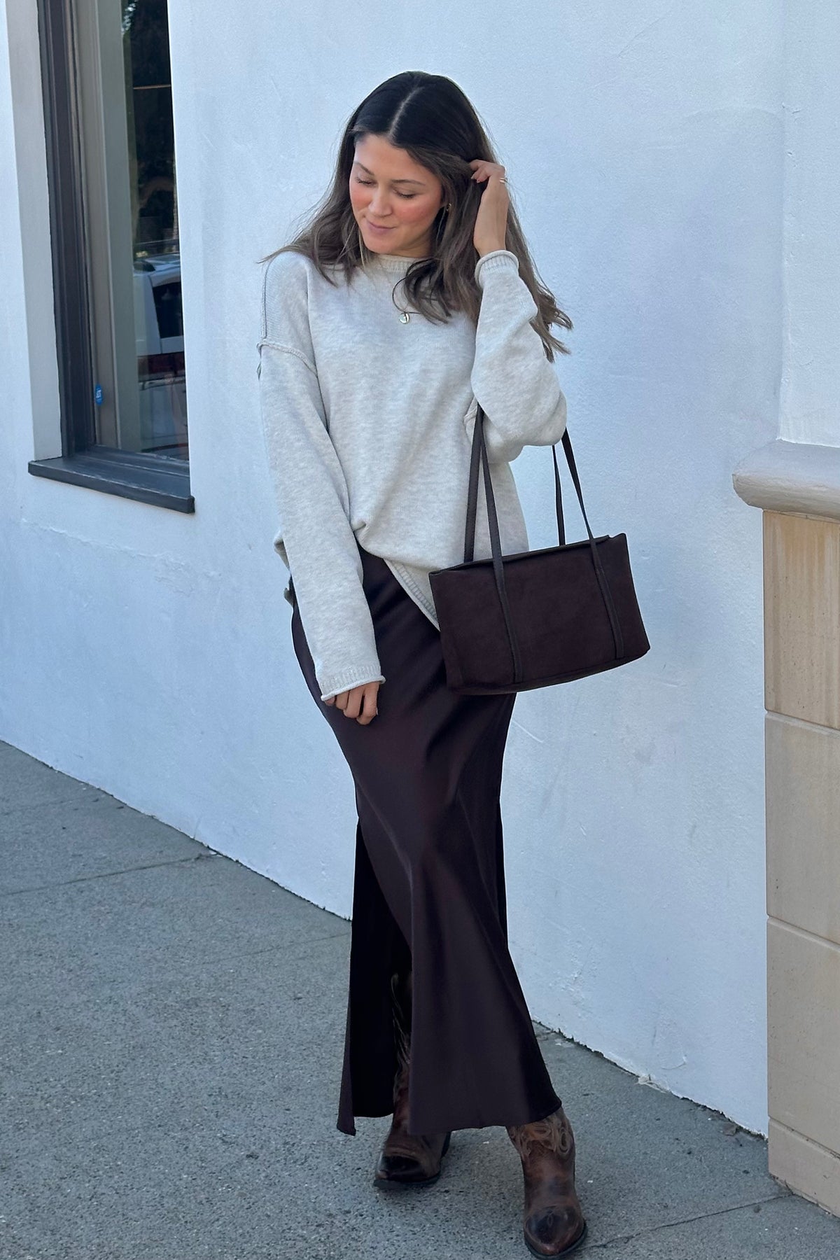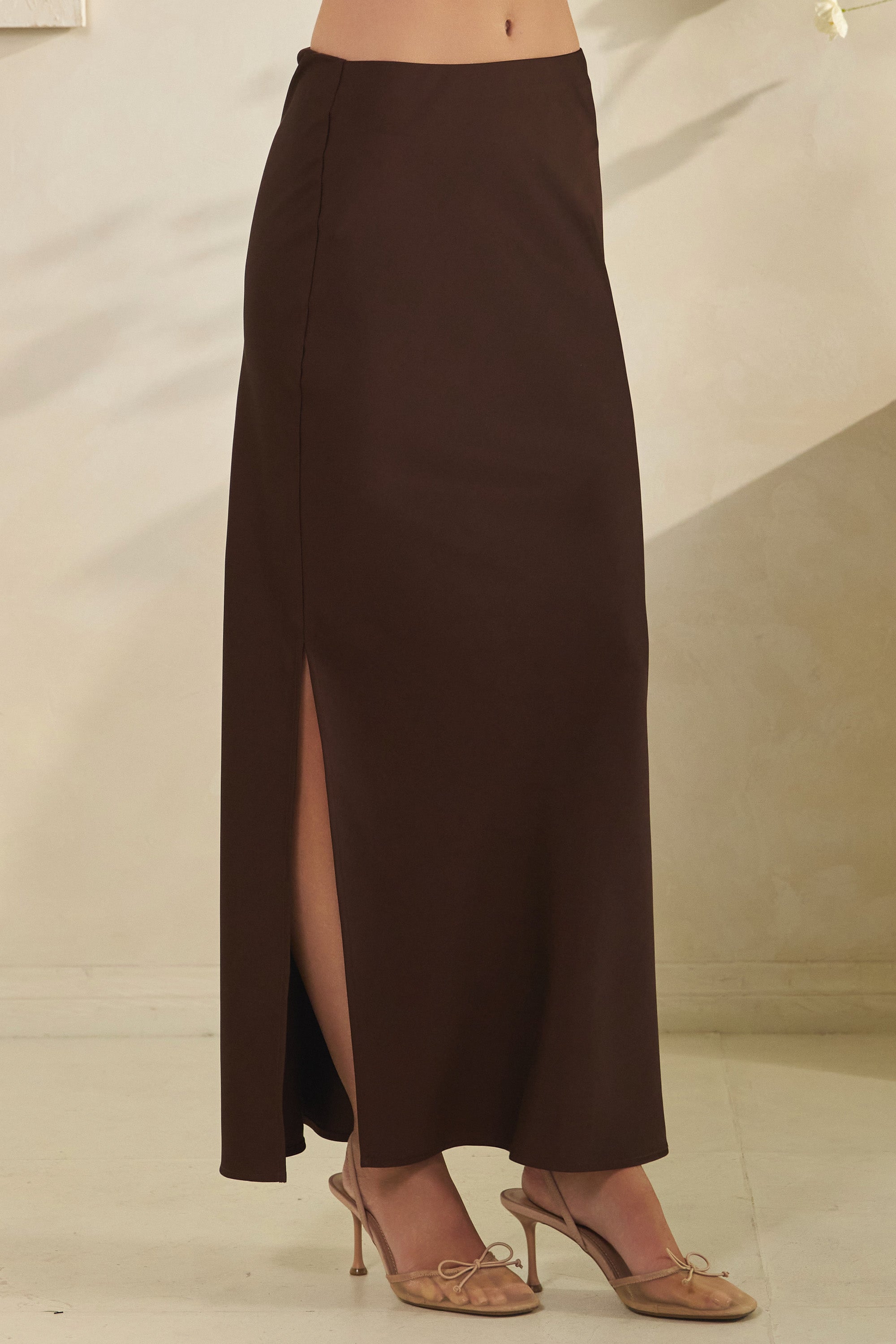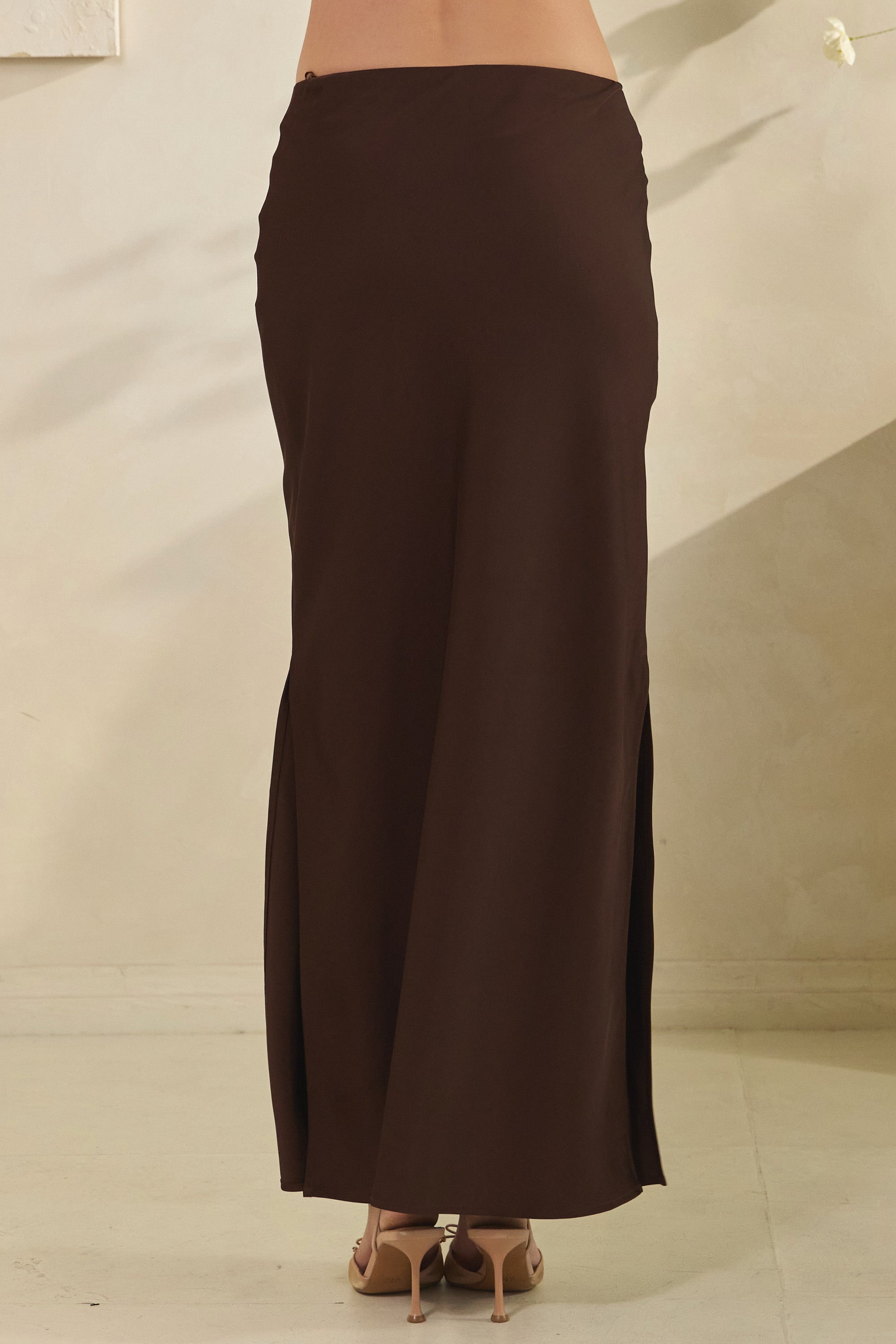Slip into effortless elegance with the Satin Dreams Skirt in rich espresso. This midi beauty features a silky satin finish that catches the light just right, paired with a comfortable elastic waistband for all-day ease. The two side slits add a flirty touch of movement and attitude—because looking cool shouldn't require any effort. Perfect for those moments when you want to feel polished without trying too hard.
