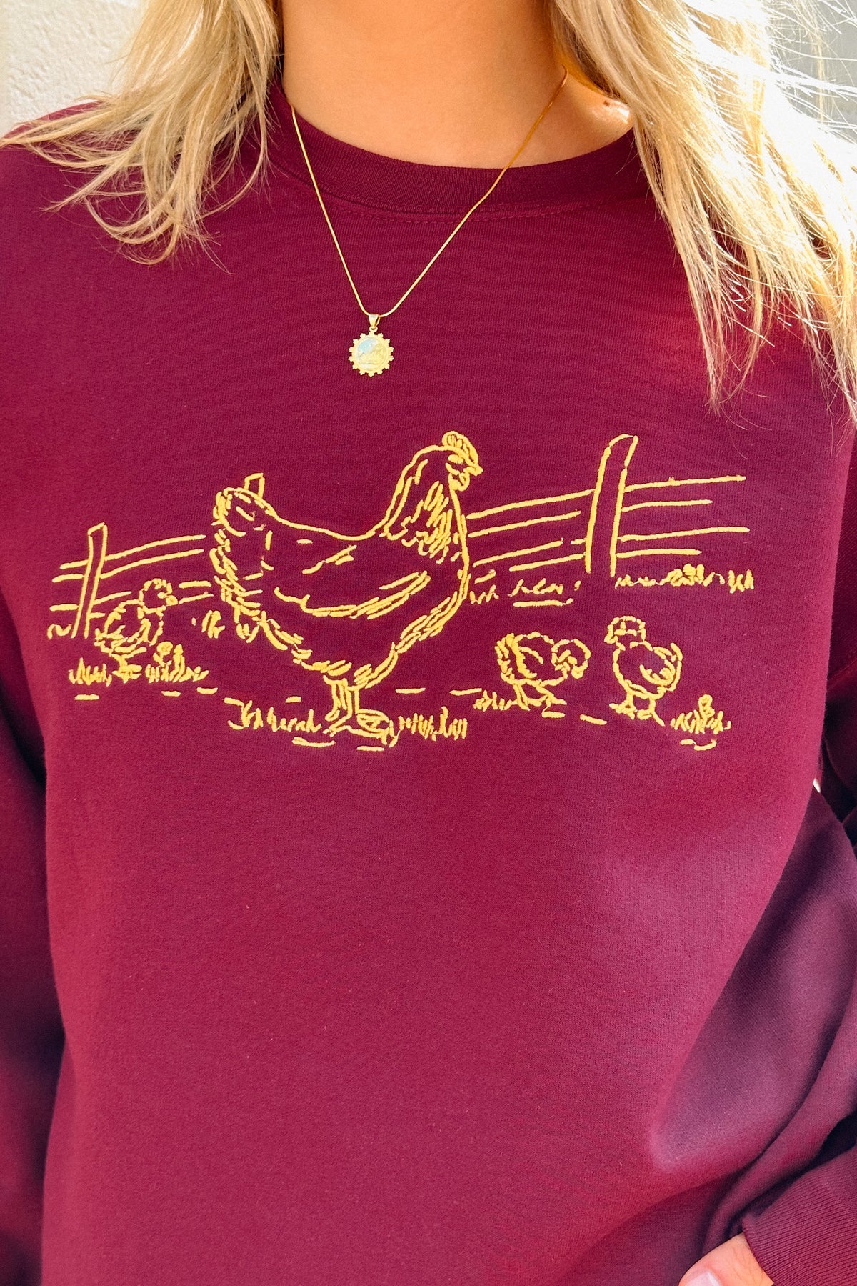 Introducing our "Good Egg" Embroidered Sweatshirt in Burgundy, featuring a charming Mama hen and her chicks -a design collaboration with artist Krista Kim! This hat is perfect for poultry enthusiasts and adds a playful touch to any outfit. Don't wait, grab yours today! (P.S. It's eggcellent!)