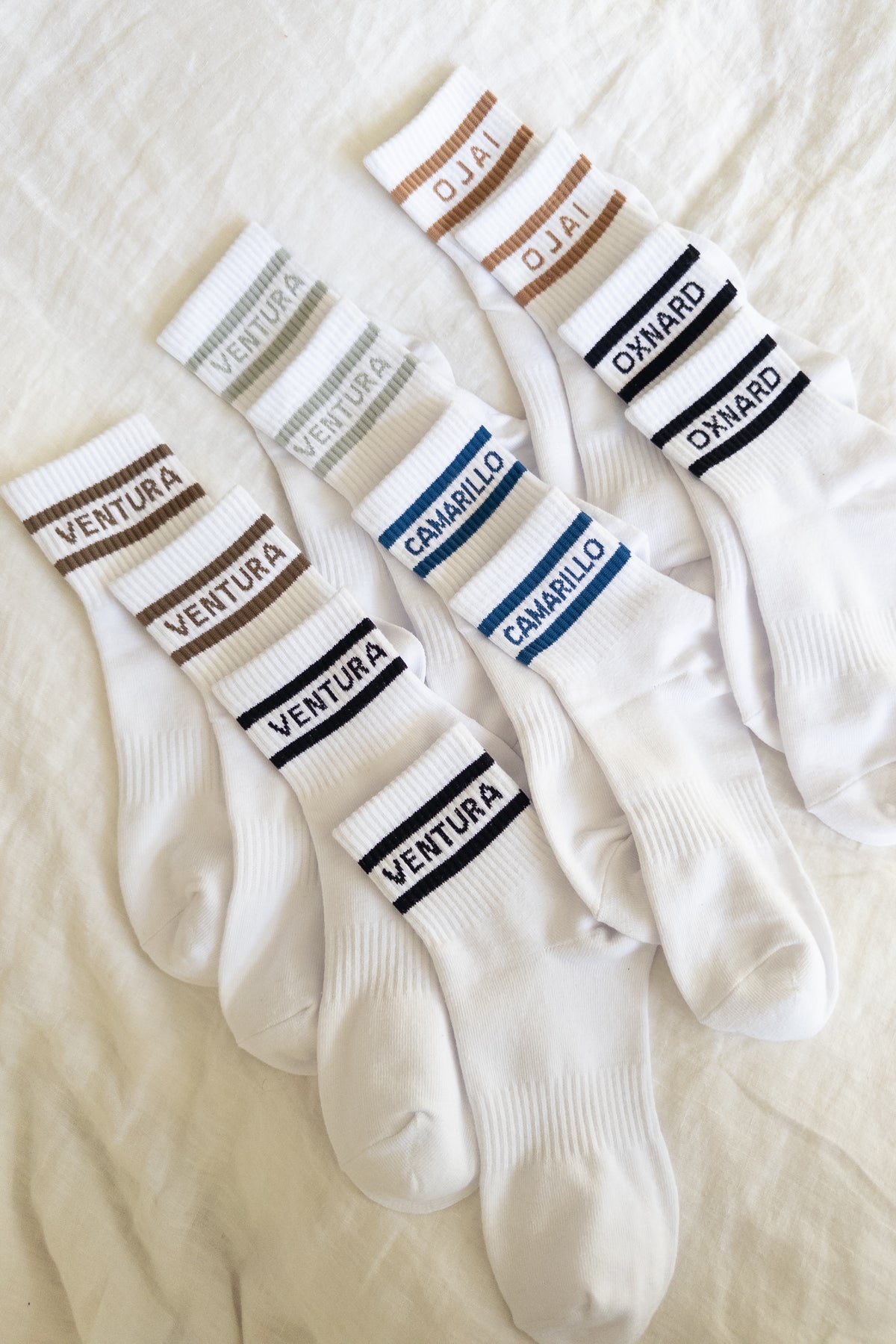Stay cozy with our latest in house accessory - our VENTURA socks! These socks feature our beloved hometown name with a retro design. We went with an ankle crew height that can be worn with your favorite sneakers and still look cute with some birkenstocks.