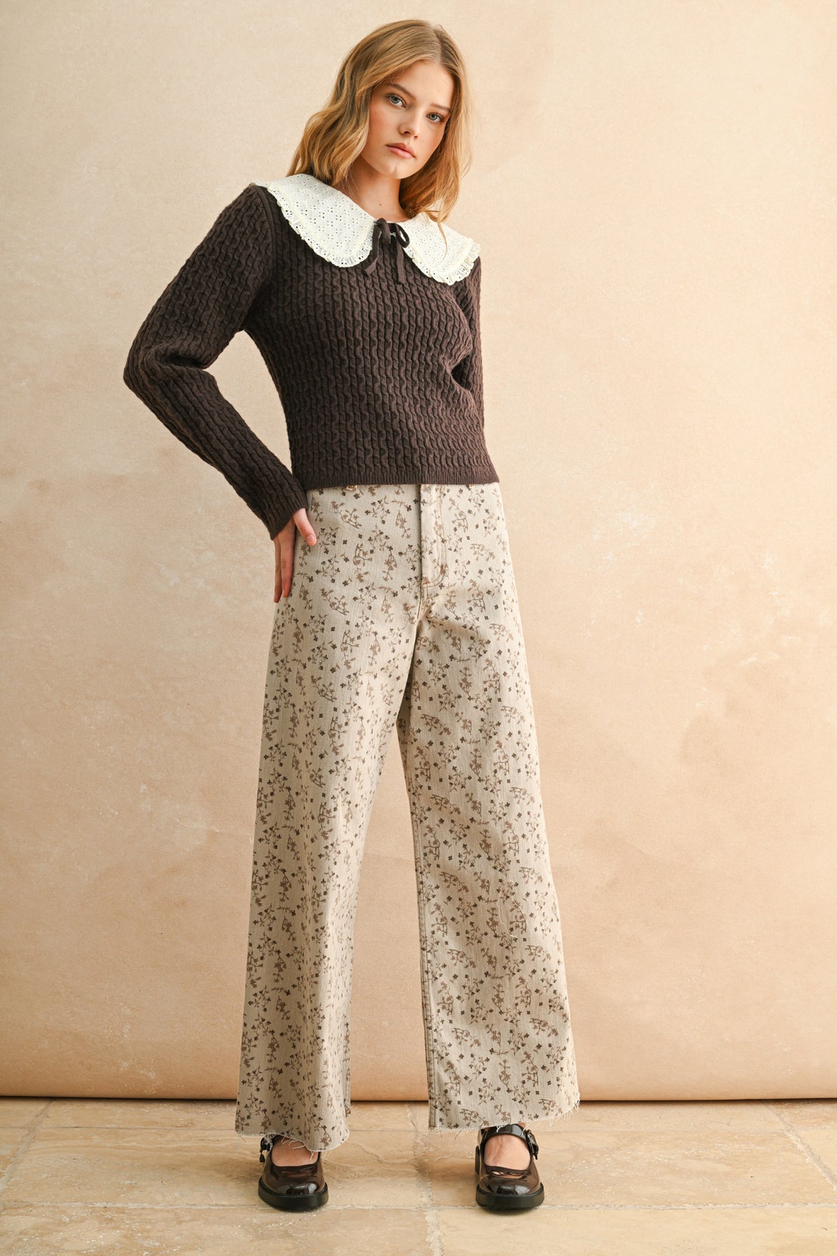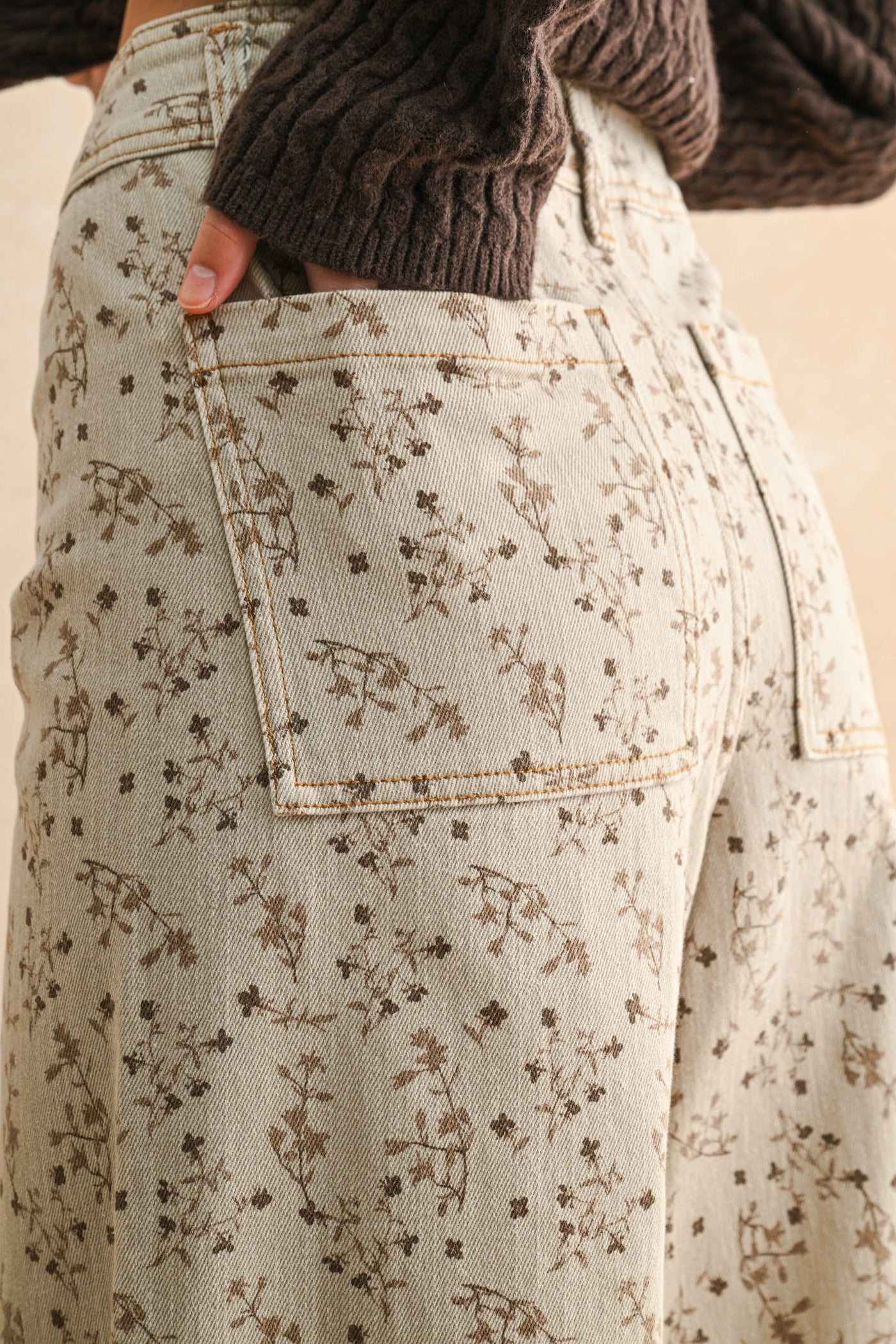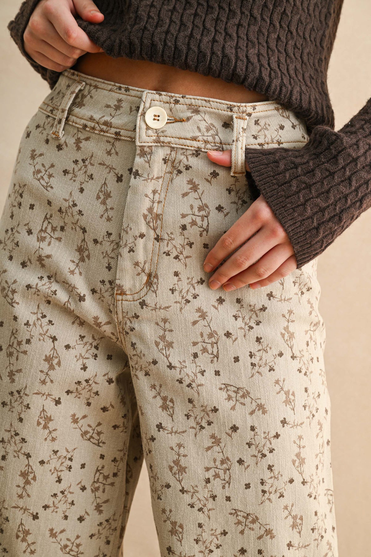 Slip into comfort with our bestselling wide-leg pants that have everyone talking. Crafted in a soft cream denim, these beauties feature an adorable brown floral detail print that brings effortless style to any outfit. Your new go-to pair is here!