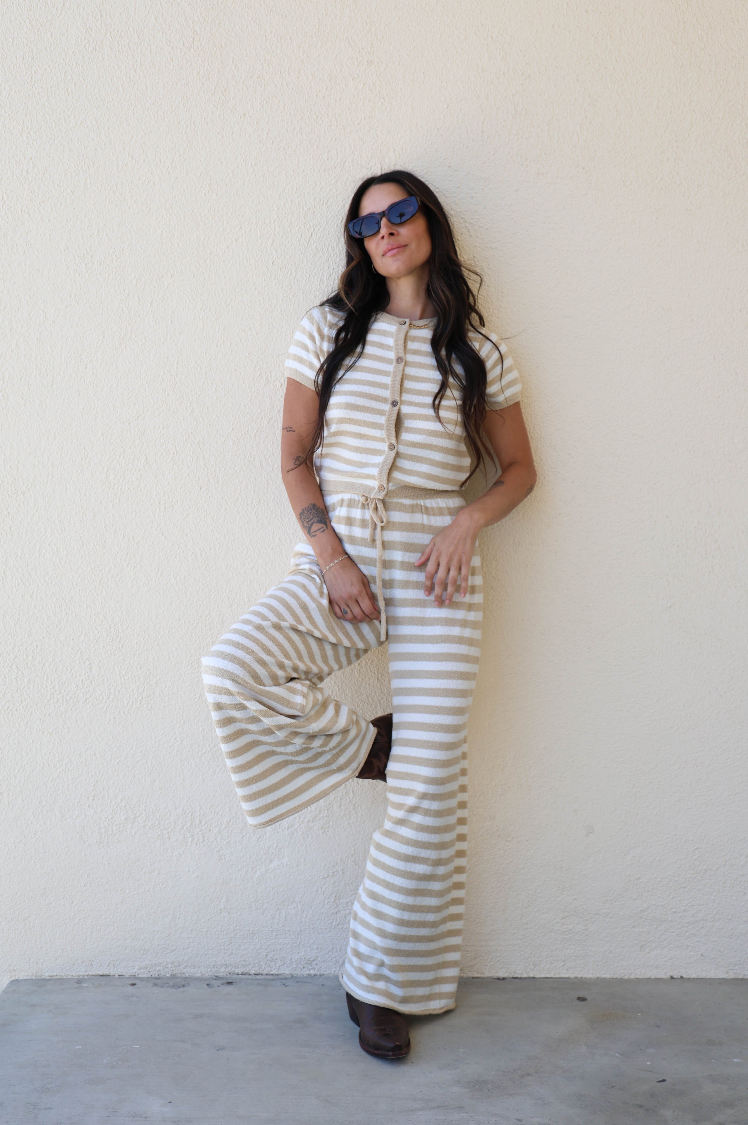 This classic striped cardigan in a soft cream base with warm sandy beige stripes is your new warm-weather essential. Featuring a rounded neckline, short sleeves, and delicate button-front closure, it layers effortlessly over matching separates, slip dresses, or tailored trousers. Polished, relaxed, and endlessly easy to style.