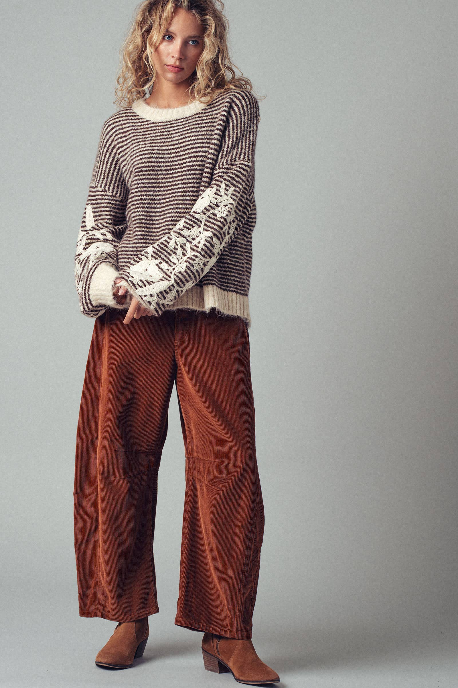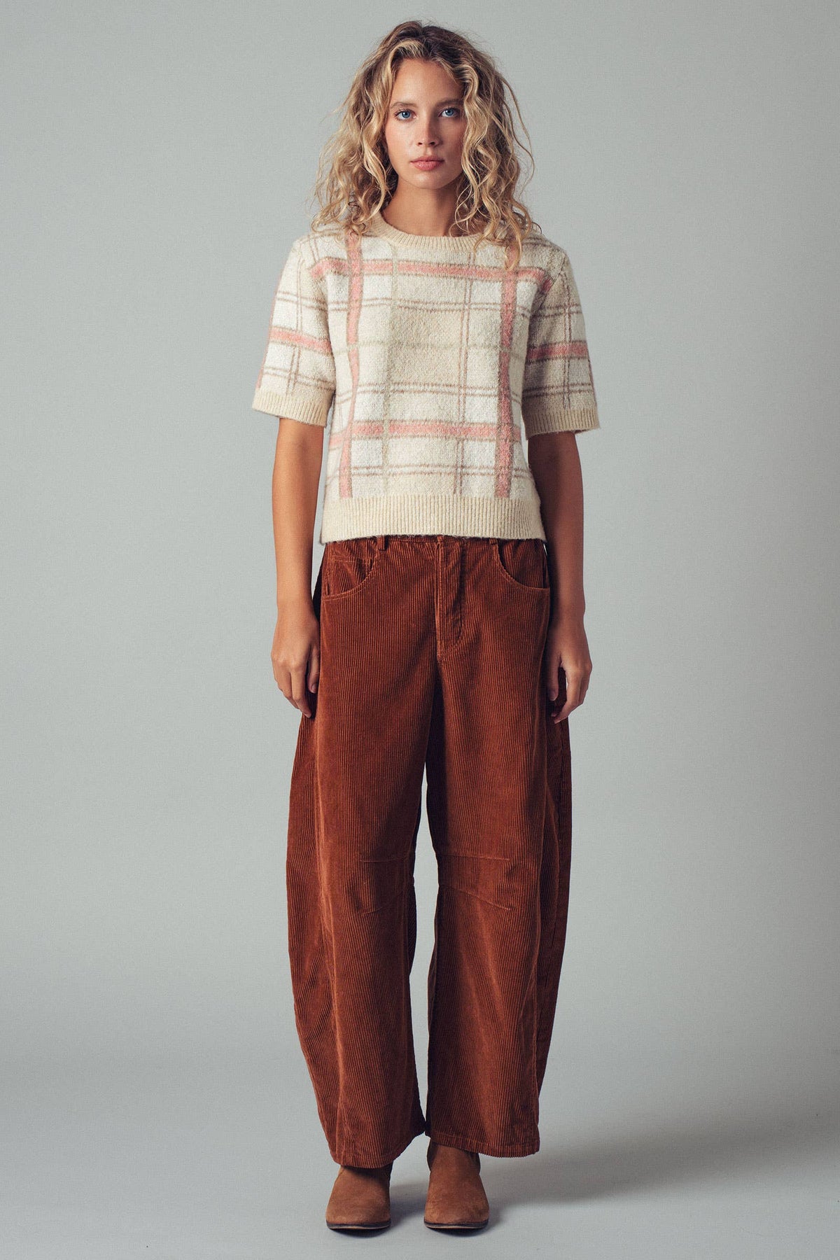 These corduroy barrel jeans offer a relaxed, contemporary silhouette with a subtle inseam stitch detail for added texture. Crafted from soft, durable corduroy, they feature a high waist, roomy fit through the leg, and cropped length—perfect for pairing with sweaters, tees, or boots.